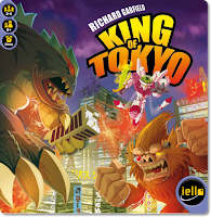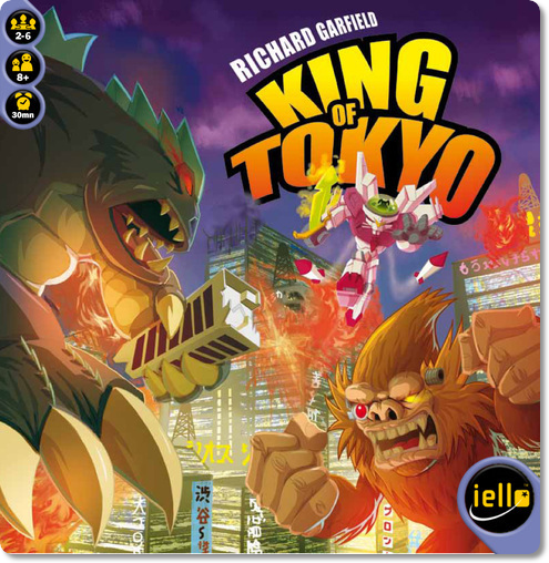 In King of Tokyo the object is collect 20 victory points or be the last monster standing. In the game players are robots, aliens, or mutants fighting to be the King of Tokyo. There are six dice with the icons for 1, 2, or 3 victory points, energy, heal, and attack. Players roll three times and decide which dice to keep. There are also special cards that can be purchased with energy to boost your rolls! It is recommeded for ages 8 and up and plays 2 – 6 players. It has a Godzilla feel to it and it is fun family game.